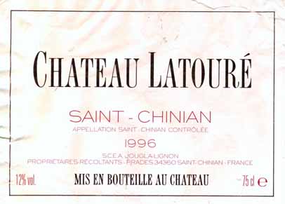 - (赤) フランス: CHATEAU LATOURE SAINT-CHINIAN (1996)