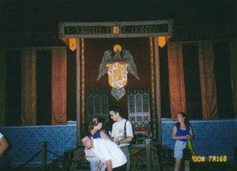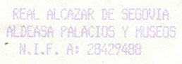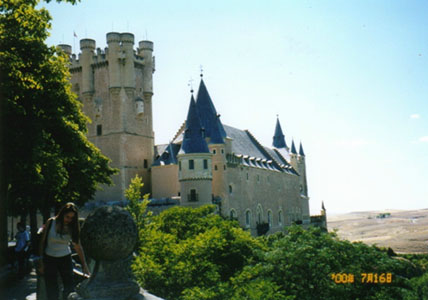 マヨール広場からアルカサルまでは細い石畳の道を歩いて10分位でしょうか。道の両側には土産物屋さんが並んでいます。ふと見ますと、鍔の広いおじさん向きの帽子が500ペセタ(300円)で売られています。日本なら2千円はするでしょう。これからのことも考えて早速買い込んでみますと、これがちょうどいい按配です。日本でなら恥ずかしくて被れませんが、スペインなら平気です。頭だけでも日差しが遮られると大分楽になってきます。先を急ぎましょう。暫く歩きますと急に視界が開けます。広場の入口に門があり、観光客が集まっているところをみますとこれがアルカサルのようです。広場の先は広大な平野へと続く崖になっているのですが、アルカサルはその崖をうまく使って建てられています。手前の方は普通の城壁スタイルですが、奥の方にディズニーランドで見慣れた優雅な塔を持つお城が見えます!これがアルカサルかぁ。。。と暫し見とれてしまいます。かようにロマンチックなお城なのです。