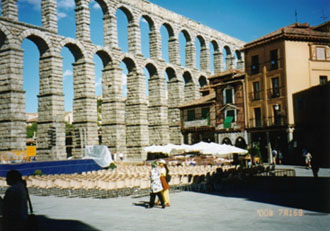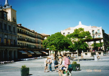 高速道路からすっかりルートを外れてしまいましたので一般道を通ってセゴビアに向かいます。時計は夕方の4時近くを指しています。今夜は9時にBUDOYAさんとお会いすることになっていますので、あまりゆっくりは出来ません。頼りない田舎道の標識を辿りながらも、ようやっとセゴビアに着きました。こじんまりした町ですが何処に何があるのか分かりません。もう町の中心を目指して進むしかありません。狭いクネクネと曲がった道を進んで行くうちに、とある崖下に着きました。見上げますと何やら巨大な教会の塔が見えます。これは地球の歩き方に出ていた『カテドラル』に違いない!と、そこで車を止めて歩いて行くことにします。外は強烈な日差しです。頭がクラクラします。なだらかな坂を登っていきますと、狭い路地の先に大きな広場があります。スペインで見た最初の広場です。とても美しいですね。マヨール広場というのだそうです。本来であればマヨール広場に突き出したBARで一休みしたいところですが、時間がありませんので先ず白雪姫のモデルとなったアルカサルに向かいます。