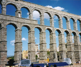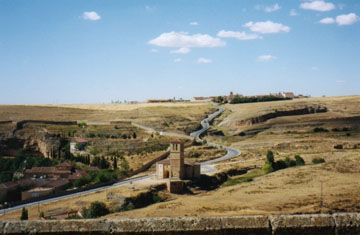 そうこうしているうちに水道橋に辿り着きました。周辺の建物はちょっと寂れた感じですが、その中で巨大な水道橋は威容を放っています。昨年訪れたフランスのポン・デュ・ガールと比べますとかなりスマートです。そのせいか、イマイチ迫力に欠けます。まぁ、昔の人は大したもんだ。。。とか思いつつ、もと来た道を引き返して車のところにもどりました。時計はもう6時を指しています。急がないとBUDOYAさんとの約束の時間に遅れてしまいます。今夜の宿である『パラドール・トルデシージャス』までは、セゴビアからN110を戻ってN−Yに入り後は一本道です。150km位の距離ですから2時間もあれば充分着けるでしょう。。。