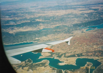飛行機は定刻にパリのシャルル・ド・ゴール空港を出発しました。パリからマドリッドまでは2時間位の短いフライトです。それでも、一応は国際線ですからちょっとした飲み物と軽いお食事がでます。マドリッドに着いたら直ぐに車を運転しなければなりませんので、アルコールは極力(キョクリョクですよ。。)控えます。パリの上空は厚い雲に覆われていましたが、飛行機がピレネー山脈を越える頃から雲が途切れ、やがてスペインの大地が眩いばかりに輝いて見えてきました。『おぉ、翼よあれがスペインか!』と思わず窓から地上を眺めます。青く見えるのは湖でしょうか?沢山ありますね。スペインの内陸部は乾燥した台地だと想像していたのですが、思った以上に緑が豊かなようです。