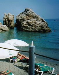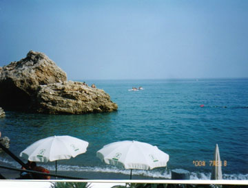 早速海水着に着替えてホテルのプライベートビーチで地中海の初泳ぎを楽しむことにします。昨年は海水着を持参しなかったばかりに、せっかくカンヌ・モナコ・ニースと云ったコート・ダジュールの最高のホテルに泊まりながら一度も泳ぐことはありませんでした。今年はちゃんと海水着を持ってきたおかげで、プールではありましたがトレドでもカルモナでも泳ぐことができました。でも、今度は地中海です!ホテルの部屋からはロビーを通らずに専用のエレベータで崖下の浜辺まで降りられます。バルコン・デ・エウロパは、ネルハの浜辺の一番グッドなところをプライベートビーチにしています。ちょうど湾曲した浜辺で、両側が岩場で囲まれていますので泳いでいる人は宿泊客だけということになります。浜辺には椅子とタイルが用意されていて自由に使うことができます。BARも勿論ありますので、喉が渇いたらよく冷えたセルベッソで潤すこともできます。テラスの先は直ぐ砂浜になっていますので、海に入るのに大して歩く必要もありません。では、早速海に入りましょう。チョト冷たいですね。。。