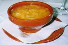 『すみませーーーん、注文をお願いしますぅ!』『ハイハイ、何に致しましょう?』『えーーーと、パエーリャでしょう、それから。。。』『あのぉ、パエーリャは昼だけのメニューなんですよぉ。。。』『えっ。。。』今更お店を変える訳にもいかず、ここは早く済ませて2軒目を探そうと心に決めます。なるべく軽いお料理を。。。と思ったのですが、悲しいかなメニューが読めません。とりあえずスープと舌平目のムニエルを注文します(変だな、どうして注文できたのだろう?)。お魚料理ならカヴァか白ワインといきたいですね。ワインリストをチェックして、スペインでは珍しいのですがお値段も手頃なシャルドネを注文します(ワインリストなら読めるもんね!)。最初に出てきたのは『Sopa de ajo(ソパ・デ・アホ)』という名前の、ニンニクと溶き卵とパンのスープのようです。勿論、オリーブ油もたっぷりと入っているのでしょう、結構ギトギトした感じのスープです。でも『アホのスープ』とは読んでも私のことではありませんよ!
