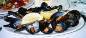 お隣のテーブルではお子さん連れのご夫婦がディナーを楽しんでおられます。と。。。何やら真っ黒なお皿がテーブルに置かれます。湯気が立ち昇ってニンニクのかぐわしい香りが漂ってきます。おいちそう!早速お店の方に『アレ頂戴っ』と追加オーダーを出します。ほどなく私の席にも黒い貝を山のように盛ったお皿がきました。ムール貝をオリーブ油とニンニクで炒めたシンプルなお料理のようです。普通、ムール貝は冬場のメニューに載りますが、ここでは真夏でも頂けるようです。もう舌平目はそっちのけにしてムール貝にかぶりつきます。おや、お隣のお父さんはムール貝の殻を外して、それをスプーン代わりにして器用に中身を取り出しています。私も真似してみまするに、とても簡単にしかもきれいに貝柱と身がとれます。それを貝殻のスプーンにのせて口のところに持っていき、ツルリと飲み込むのです。手はベタベタになりますが、ニンニクの香りの効いたムール貝は最高の味です。もうシャルドネがいけるいける。。。