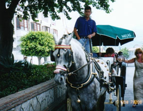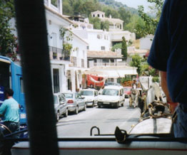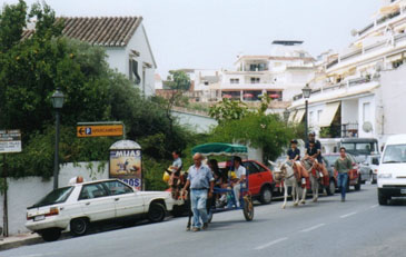 ミハスへ通じる道路に入りますと後は迷うことはありません。一本道なのです。ですが、結構急な坂道ですのでスピードはガタ落ちになります。後続の車にはせかされますが、シフトダウンしてもなかなかスピードが上がりません。あんまりアクセルを踏み込んだものでエンストを繰り返し、やっとのことでミハスの町の入り口に辿り着いたのはお昼を大分過ぎていました。ここがミハスかぁ。。。と、あたりを見渡しますが何となく観光地らしからぬ家並みです。どこが白い村なんでしょう。。。狭い道ですが、もう少し奥に進んでみます。おや、馬車がやってきます。段々と観光客っぽい人達も見えてきました。ミハスの白い家は村の奥の方にあるようです。大した距離は走らなかったのですが、ちょっと疲れました。車を適当な場所に停めてBARでちょっと一休みします。