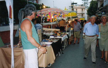 駐車場から出て来るときに見つけた通りを歩いていきます。通りの両側にはいろんなお店が並んでいます。地元の方の日々の生活を賄うお店が多いのですが、観光客相手の露店も結構並んでいます。日も落ちて暑さもちょっとはしのぎやすくなったためか、親子連れも多いようです。日本だと晩御飯の後のお散歩になるのでしょうが、スペインではこれから今日何回目かのお食事タイムになる訳です。何を買うでもなくいろんなお店を覗いていきます。こういうのが一番楽しいですね。