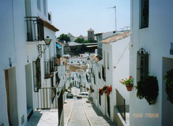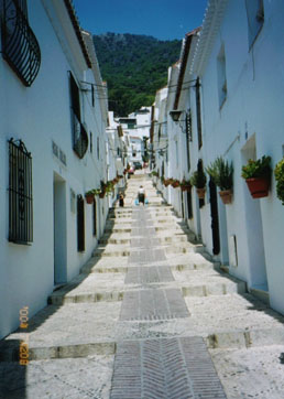 単に白い家並みであれば、スペイン各地に見られます。その中でミハスが特に有名なのは、白い家々が坂道に沿って並んだ美しさにあるのではないかと思います。どの家も新しいということはないのですが、よく手入れがされているのです。真っ白い壁に掛けられた南国の赤い花籠が強い日差しで更に鮮やかさを増しています。ちょうどシエスタ時なのか、通りを歩いているのは観光客だけのようです。ふと見上げますと、両手に袋を下げたおばあさんが白壁の間の長い石段をゆっくりと登っていきます。写真でもよく紹介される『ミハスの白い村』の風景です。長い石段の先には緑の山と青い空が迫っています。白と緑と青、そして鮮やかなコントラストをなす赤い花。。。この世にこれ以上の美しさがあるのでしょうか。。。
