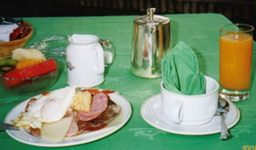 今日は何から頂きましょうかね?先ず、生ハムでひょう!チーズでひょう!卵焼きでひょう!そうそう、フレッシュなオレンジジュースでひょう!勿論一皿では終わりませんよ!今日は結構歩きますから、しっかり食べておきませんとね!