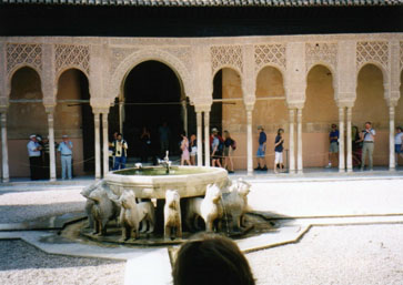 アラヤネスの中庭から左に進みますと、ライオンの中庭に出ます。周囲にはムハンマド5世時代の124本の大理石柱から成るアーケードがめぐらされ、中央に12頭のライオンに支えられた噴水があります。ここはハーレムとなっていて王以外の男性は立ち入り禁止で、2階の部屋には王の后(きさき)達が住んでいました。
