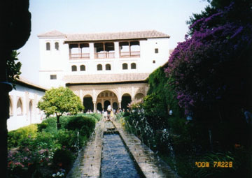 『ヘネラリフェ』は王の夏期の別荘でした。13世紀より建設され、花々とシエラ・ネバダの水の饗宴はアラベスク模様に包まれて実に美しい風景です。糸杉や夾竹桃の散歩道は、照りつける光に影を与え、ふんだんに使われる水音がギター曲『アルハンブラの思い出』のトレモロのように、過ぎた日々のささやきを伝えます。