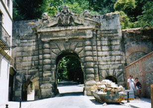 パラドールから王宮へは宮殿内の道を通って直接行くことができます。市街地からアルハンブラ宮殿に行くには、大した距離ではありませんが、ゴメレス坂をミニバス(アルハンブラバスと云います)か徒歩で登ることになります。このコースを通ると、最初に『グラナダスの門』に出合います。