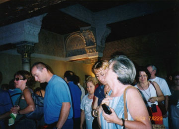 ライオンの中庭に面して3つの部屋があります。南側にあるのが『アベンセラッヘスの間』で、王族のアベンセラッヘス家の者がハーレムの女性に近づき首をはねられ、その首は部屋中央の噴水に置かれましたが、首から流れ出す血はライオンの噴水まで届いたということです。中央には『王の間』があります。天井画には10人の王が描かれていますが、イスラム芸術では決して人の顔を表現しませんからこの絵はグラナダ陥落後のキリスト教徒の手になるものと考えられます。アベンセラッヘスの間の向かいにあるのが『二姉妹の間』です。ここの鍾乳石飾りは、宮殿内で最も繊細かつ精密と云われています。