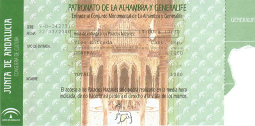 アルハンブラ宮殿の入場チケットの販売は閉館(夏季20:00、冬季:18:00、曜日によって違います)1時間前までとなっています。ただ、1日の入場者数は8千人と限られていて(日曜日は6千人)、夏の観光シーズンに昼頃のんびりと訪れたらもうチケットは完売で入場できないということも多いそうですからご注意下さい。尚、チケットには『Hora xx a xx』と書かれていて、指定された時間帯に王宮に入らなければ無効になります。私のチケットでは、『10:00から10:30の間に王宮に入ること』と書かれています。チケットのお値段は1000ペセタ(600円位)なのですが、自分で買うとなると時間と手間が結構大変なようです。尚、スペインでは入場時にチケットの端っこを手で千切ってしまいます。大雑把というか何というか。。。