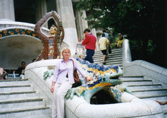 あっという間にLesseps駅に到着しました。グエル公園はここから7−8分歩いた住宅地の中にあります。ところどころに案内の標識はあるのですが、アップダウンの道を右に左に歩いていきますと方向感覚がなくなってしまいます。でも、観光客風のグループの後について行けば大丈夫です。ようやく、道路から一段高くなった丘の上にグエル公園が見えてきます。小雨のパラつく生憎のお天気でしたが(今回の旅行で初めて傘をさしました)、公園の入口の前の狭い道路には観光バスやタクシーが並んでいます。入口の階段は世界中からやって来た観光客で一杯です。さすがに、バロセロナでも人気のある観光スポットのようです。階段を上がった先は広場になっています。広場の先にはもうひとつの階段があり、ここに有名なワニ。。。いやトカゲ。。。恐竜?あれ、何でしたっけ?何かのモザイク像が置かれています。写真のアングルとしては最高の場所ですので、観光客には特に人気があります。モザイク像の口からは水が流れていますので、つい手を出してしまいます。おーーー、これで私もガウディにあやかれる。。。とか何とか感慨にふけっていますと、『ちょっとーーー、写真の邪魔だからどいてよぉ!シッ、シッ』と娘さんに怒られます。犬じゃあるまいし、シッ、シッはないでしょうに。。。しょうがない退散しましょう。