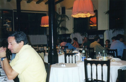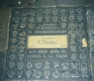 このお店では、順番待ちの人達は入り口のところに並んでいなければなりません。ウエイターの方が時折顔を出しますので、その時に予約簿に名前を書き込んでもらう訳です。後は自分の名前が呼ばれるまで、ひたすら表で待ち続けなければなりません。ふと地面を見ますと、石畳の間にこのお店の名前を刻んだプレートが敷かれています。ふーーーん、さすがに有名なお店は違いますね。どうでもいいですけど、さっきから耳元を蚊がかすめます。半袖ですので蚊に対しては全くの無防備です。昨年、マルセイユで蚊に刺され、しつこい痒みに音を上げたことを思い出します。手で蚊を追い払いながら列に並んでいるのですが、なかなか私の順番がきません。早く中に入れて下さーーーい!