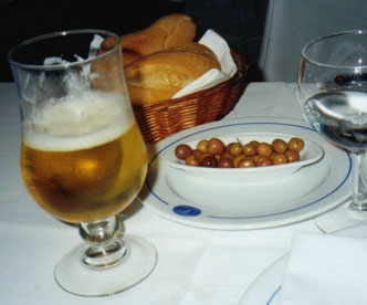 先ずはセルベッソをキューーーッ。。。おいぴい!ふと隣のテーブルを見ますと、あれがサルスエラ(カタルーニャ版ブイヤベース)でしょうか、濃厚な魚介類のスープが大きなポットに入って置かれています。早速ウエイターさんに、『あれ頂戴!』と追加注文を出します。外の蒸し暑さとは別世界の涼しさで食欲も大いに刺激されます。うーーーん、このセルベッソは超美味しいですね!