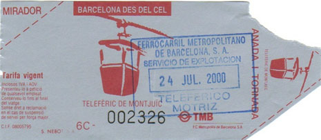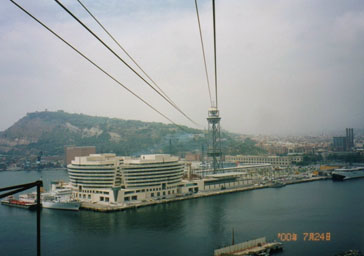 急な坂道を登っていきますと、寂しい公園のようなところに出ます。ますます不安になりながらも更に登りますと、突然視界が開けて大きな通りに出ます。やっと車が行き交うようになりました。ちょっと離れたところにゴンドラの発着所が見えます。ヤレヤレ。。。(尚、地下鉄2号線と3号線のPALAL−LEL駅からモンジュイックの丘へ登るケーブルカー(フニクラ)が出ています。5分位でゴンドラの発着所まで行きますから、ロープウエイを使わなければこちらの方が余程便利なようです。)ゴンドラは4人乗りの小さなカプセルになっています。向かい側の乗客と膝がくっつきそうになりますが、この際お互い我慢しましょう。でも、このゴンドラもかなり不安定ですね。不安定な上に高度も結構あります。足元に木々のてっぺんが見え、何となく足の裏がムズムズする感じです。