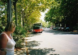 広場の中央には要塞のような巨大な建物があります。昔はお城だったらしいのですが、今では軍事博物館になっています。面白そうなので中に入ってみようとしましたが、何処にも入口が見つかりません。どうも月曜日は休肝日。。。じゃなくて、休館日のようですね。最初で最後になるであろうバロセロナ市街の眺望を充分に堪能した後で再びゴンドラに乗って丘を下ります。先ほどの大通りに出ましたら向こうからバスがやってきます。バスに乗るのも面白いですね。運行図をチェックしますとスペイン村まで行けそうです。ラッキー!早速バスに乗り込みます。えーーーと、8つ目の停留所ね。。。