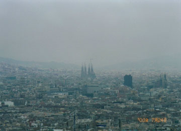 ゴンドラに乗ったまま途中の中継所で向きを変え、やがてモンジュイックの丘のてっぺんに到着します。丘の上は広場になっていて、あちこちに展望スポットがあります。お天気もいいし、バロセロナの市街と地中海が全て見渡せます。その中でもサグラダ・ファミリア聖堂は異彩を放ちます。やっぱり、サグラダ・ファミリア聖堂はバロセロナのシンボルですね。
