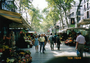 ランブラス大通りは、バルセロナ市の中心であるカタルーニャ広場と港に面するコロンブスの塔を結ぶ目抜き通りです。辞書には『水の流れ跡』と出ていますが、この通りの下にはかって旧市街に水を供給した水路があったということです。通りの両側には名物の花屋や本屋の他に、南国から来た珍しい小鳥や小動物を売る店やロテリア(宝くじ)の売店などが軒を連ね、道行く人の足を止めさせます。幾度か繰り返された戦争の只中でもこの通りから花と本が消えることはなかったということがバロセロナっ子の誇りです。少々歩き疲れたら、通りの脇に置かれたベンチに腰をかけて道行く人を眺めるのもランブラス通りの味わいのひとつです。パリのシャンゼリゼ通りを歩く通行人のようにとりすますこともなく、思い思いに散歩を楽しんでいます。土曜日・日曜日ともなりますと、民芸品を売る店や大道芸人達が集まってきて、ますます賑やかになります。観光客や家族連れ、老人、学生、失業者、ジプシー、それにスリやかっぱらいのたぐい。。。まるで人間の見本を見ているようです。この賑わいは夏なら深夜過ぎまで続きます。この通りは買い物をするというより、そぞろ歩きを楽しむのに適しています。ランブラス大通りに面したBARやレストラン、衣料品店や土産物屋などは他の場所に比べますと概して割高です。