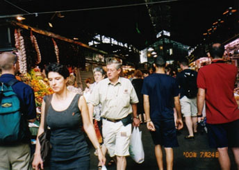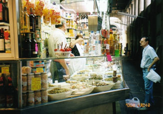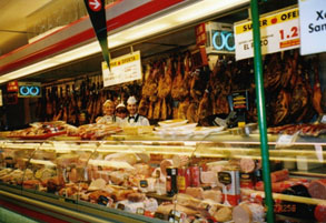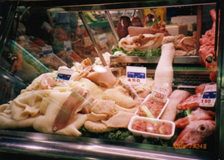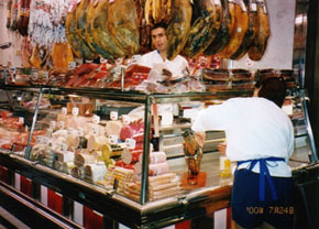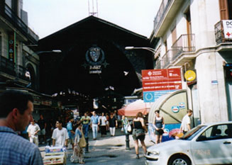 スペインはヨーロッパの中でも生鮮食料品の流通システムが最も進んでいる国ですが、バロセロナはその中でもトップクラスにあります。ランブラス大通りの真ん中より少しカタルーニャ広場寄りにあるサン・ジュセップ市場は、バロセロナ市内で最もスケールが大きく、しかも進んだ流通システムのおかげで何でも新鮮なバロセロナっ子の自慢の市場です。朝10時頃から午後1時過ぎまでがピークの時間帯で、昼休みを挟んで夜8時頃まで賑わっています。見たこともないような果物や魚介類が一杯で、スペイン人の食への貪欲さが一目瞭然です。新鮮な野菜や果物を買って旅先で不足しがちなビタミン類をここで一気に補給するのも良いでしょう。冬から春にかけてはオレンジ、夏はメロン、夏から冬までは梨や葡萄など、その味はまさに地中海の自然の賜物です。お手製サンドイッチ用に名物のハモンセラーノ(生ハム)もついでに仕入れてみては如何でしょうか?1kgの単位になっていますが、100gから売ってくれます。『エスト、シェングラモス、ポルファボール(これ100g下さい)』と言えばいいのです。買い物が特になくても、肉屋さんの天井からぶら下がった豚の頭の塩漬けや、さまざまな野鳥や、皮を剥かれたウサギなど、珍しい食品が一杯で退屈することはありません。