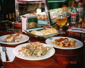 お店の入り口に立ってみますと、床は何とガラス張りになっています。その下は砂が敷き詰められていて、おシャレにもお店の名前とかお魚とか蟹とかが描かれています。なかなか楽しいデコレーションです。でも、このお店はレストランというよりかは、ちょっとした軽いお食事と飲み物を楽しむスナックのような感じです。入口近くにはBARのようなカウンターがあり、足の長い椅子が置いてあります(私の足は床に届きませんでした。。。)。