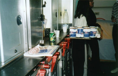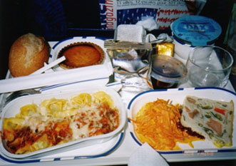 それに加えて、最近では機内のキッチンの一部をカーテンで仕切ってミニ・バーと喫煙室にしている飛行機も多いようです。希望すれば、簡単なサンドイッチやカップ・ラーメンを頂くこともでき、狭い機内での息抜きにはもってこいのサービスです。こういうサービスがありますと、別に欲しくはなくてもカップラーメンを食べたくなるのが人情というもの。。。でも、あんまり食べ過ぎますとお腹を壊して大変なことになりますので程々に。。。