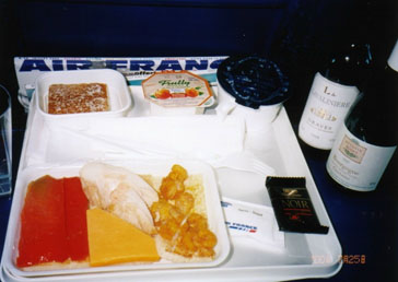 12時間のフライトが14時間になり、おまけに着たきり雀の身であれば惨めさを通り越して、もうどーーーでもいい気持ちになってしまいます。そんな気持ちを救ってくれたのがエール・フランスご自慢のお食事とワイン。。。
