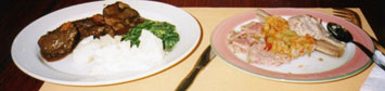 BARには大したおつまみもないので、そうそうビールが飲めるわけではありません。ディナーまでは部屋で休むことにします。ホテルのフロントの前を通りますと、先ほど空港で行列していた人やバスに乗れなかった人がチェックインをしています。このホテルのレストランはとても小さいので、これはきっと混雑するに違いないと早めにディナーを頂くことにします。これは正解でした。レストランがオープンしますと、またたく間に席は埋まり入口にはまたまた長蛇の列ができます。フロントで配られた食事券を差し出しますと、団体専用のテーブルに座るように言われます。自前でもいいのですが、今夜は宿泊客が多いので無理なのでしょう。このディナーを逃しますと、明日ドゴール空港に着くまでまともな食事を頂くチャンスはありません。一応、ビュッフェ・スタイルですのでお料理をガヴァとお皿に盛り付け、大きなガラス製の水差しに入った赤・白のテーブルワインと一緒に頂きます。お料理はマアマアでしたが、このワインはちと。。。