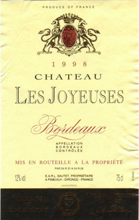 - (赤) フランス: CHATEAU LES JOYEUSES BORDEAUX (1998)