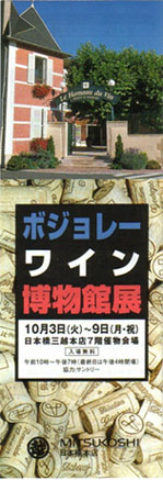 さすがにフランスは食の国だけあって、会場にはチーズやハムやパテなどのワインの友が充実しています。大きなオマール海老が1匹千円とはお買い得です。お腹が空いていますので、会場内の特設レストランにも心が惹かれますが、ここは我慢・我慢です。ワインのコーナーは産地別に分かれていますが、さすが天下の三越デパート。。。高級品が多いですね。でも、お客さんはそんな高級ワインをショッピング籠が壊れるのではないかと思える位に買い込んでいきます。勿論、手に持って帰れませんので宅配サービスを利用する方が多いようです。そのためか、レジの横には高級ワインが山積みされています。私は千円ワインを2本だけ買ったのですが。。。会場の一画にはボジョレー・ワイン博物館から持ち込まれた資料が展示されていました。割と簡素な内容ですが、なかなか興味があります。