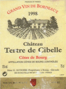 - (赤) フランス: CHATEAU TERTRE DE CIBELLE COTES DE BOURG (1998)