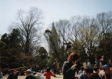 それはさておき、私は昔々のその昔に新宿御苑に来たような記憶がありますが、お花見に来たのは初めてです。12時半頃に御苑内に入ったのですが、芝生には既に花見客が溢れていて殆ど空きスペースは残っていません。そこを何とか。。。と、シートを敷きます。太陽が燦燦と照りつけ、シャツ1枚でも充分な位の暖かさです。土曜日の凍えるような寒さが嘘のようです。あたりを見回しますと、新宿の街並みも随分と変わったものです。木々の向こうには、まるでニューヨークのエンパイアステートビルのような形をしたNTTの細いビルが建っています。