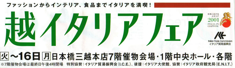 そのイタリア年への協賛なのでしょうか、『三越イタリアフェア』なるものが三越本店で催されるのだとか。。。というわけで、早速出掛けてみました。三越本店の7階には大催し物会場がありますが、その広いスペースの大半を使ってイタリアの物産が所狭しと並べられています。ガラス細工などの展示もあったのですが、足は自然と試食コーナーへ向かいます。さすがにイタリアは食の国、ワインにチーズに生ハムにパスタ。。。どれも美味しそうですね!小さな皿の上にほんのひとかけら盛られた試食用のチーズやハムに向かって四方八方から手が伸びてきます。親鳥の嘴(くちばし)に群がるお腹を空かせたヒナドリの気持ちがよくわかりますね。ワインの試飲はさすがにそうはいきません。売り子さんの説明に相槌を打ちながら、小さなカップにワインをほんの少し注いで頂きます。試食コーナーと試飲コーナーをうまく組み合わせますと、量は少なくても結構いろんな味が楽しめます。いやーーー、気分は既にイタリアですぅ。。。Mangiare!Vino!Italiano!