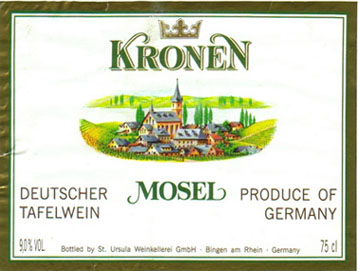 - 『クローネン モーゼル』は、軽やかな甘さとすっきりとした飲み口が特長です。ミュラートゥルガウ、ケルナー、その他の葡萄から造られ、ソフトなプロセスチーズなどと合います。やや甘口で食前酒としてもよく、7−9℃に冷やしてお飲み下さい。