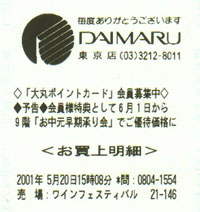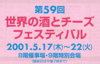大丸デパートでは、毎年春と秋に『世界の酒とチーズフェスティバル』が開催されます。凄まじい本数のワインとチーズが大丸デパートの広い催し場を埋め尽くすのですが、若干のハムやパンなどを除けば、文字通りワインとチーズが主体の非常にシンプルな構成です。売り場のレイアウトは毎年同じで、地域別・等級別・お客さん別にきれいに層別されていますので、はっきりとした目的を持っている人(つまり、あのぉ、安いワインしか興味がない人とか、日本では滅多に見かけない幻のワインを探している人とか、見切り品の山の中から掘り出し物のワインを探し当てたい人とか)には余計な手間をとらせません。私もこういった点が気に入って、もう何度か足を運んでいます。えっ、私がどのタイプになるかですって?そりゃあ。。。