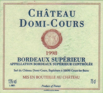 - (赤) フランス: CHATEAU DOMI-COURS BORDEAUX SUPERIEUR (1998)