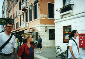 ヴェネチアのいいところは、狭い地域にいろんなお店が密集していますので、何でも直ぐに用が片付くことです。銀行もホテルからほんの1−2分のところにありました。ツアーだとあまり現金は要らないのでしょうけど、個人の旅行客はいろいろと現金で支払うことが多いので、ちょっと多めに両替しておきます。市中の銀行ですが、やはりレートは成田よりは遥かにいいようです。百何十万リラというまとまったお金が手に入りますと、やはり安心感が違います。ついでに、ヴェネチアからボローニャまでの列車のチケットを買っておくことにします。国鉄を利用するのは5日間なのですが、国鉄のパスは4日分しかないので距離的に一番短い今日の区間はパスを使わないでチケットを購入した方が安上がりです。銀行からちょっと歩くと旅行代理店が見付かりました。早速入ってみます。朝の開店早々だったせいか、お客さんは2−3人しかいません。列に並んでいますと、先頭のお客さんが旅行会社の窓口の係員に何やらしきりに話し掛けています。お客さんが何か質問すると、係りの社員は身振り手振りを交えて受け答えをしています。身振り手振りをしている間は書類から目が離れますし、コンピュータも操作できません。列の後ろで待っていますと、日本人には結構辛いものがあります。