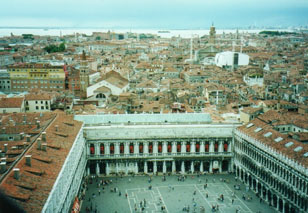 当たり前のことですが、塔の上から見ますとヴェネチアが島々から成っているのが良く分かります。しかも、その島の一つ一つはとても小さいのです。全て海面下に打ち込まれた木の土台の上に建てられたのでしょうけど、未だにその機能を果たしているとは驚異です。それにしても風の強いこと!髪がクシャクシャになってしまいます。