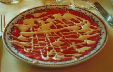 で、お待ちかねのカルパッチョが静々とテーブルに運ばれてきました。おんや。。。小さなお皿ですねぇ。それに何と薄く切った肉でしょう!紙のような厚みです。付け合せはといいますと、このお値段なら普通はこてこてのこてりんこに飾り付けするのでしょうに、何とマヨネーズだけのシンプルさ。。。余程、味に自信があるのでしょうね。どれどれ、フォークで2−3切れすくって口に入れます。お。。。柔らかい!脂身の全くない極上のモモ肉のようです。これなら年取ったお母さんでも十分に食べれたことでしょう。外国の肉は固くて味がないと信じこんでいる人たちにも是非食べて頂きたい一皿ですぅ。
