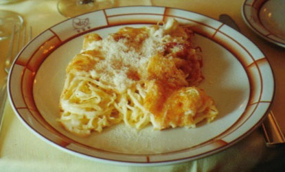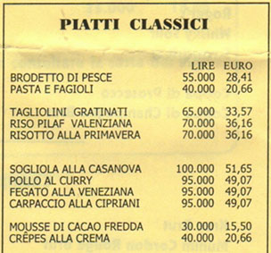 私のお目当てはカルパッチョです。メニューを開いて探しますと、他のお料理と一緒に小さな文字でさりげなく『CARPACCIO』と書かれています。その隣のお値段を見ますと、『95,000』とあります。えっ。。。徹夜の疲れで”0”がダブッて見えるのか、はたまたコンマがカンマに見えるのか。。。けれども、どう見ても9万5千リラにしか見えません。両替のレートからすると、約6千円近くにもなります。ひえーーーっと後悔の念が押し寄せてきますが、気を取り直して注文します。なんせ、この機会を外したらもう二度と元祖カルパッチョのお店には来れませんからね。それから、えーーーと蜘蛛蟹のサラダね。と、と、と。。。これまた9万リラもします。えーーーい、もう破れかぶれだぁ。。。これも頼んじゃお!ついでにパスタも。。。