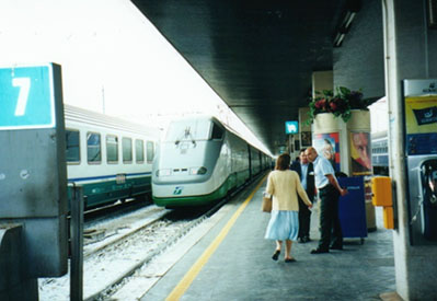 さあーーーて、あんまりゆっくりはしてられません。ホテルに戻って荷物を受け取り、水上バスの船着場まで急ぎます。といっても、ほんの10m位ですが。。。ところが船着場に着きますと、これが大変な混雑です。どうやら島に泊まらず日帰りの観光客が多いらしく、ちょうど帰りのラッシュにぶつかってしまったようです。切符を買うのもやっとで、その上水上バスがなかなかやってきません。ユーロスターの出発時刻は迫っているし、気が気ではありません。やっと水上バスがやて来たと思ったら、あっという間に満員になってしまいました。それも、バス停に止まる度にその騒ぎが繰り返されるのです。時計を見ながら、水上バスがベニスの表玄関であるサンタ・ルチア駅に着くのをじりじりして待っていますと、さすがに船にはこれ以上のお客さんが乗れなくなったのか、水上バスは途中の停留所をすっとばしていきます。やっとサンタ・ルチア駅の船着場に着きます。やれやれなんとか列車に間に合いそうです。駅へと続く緩い階段を上がっていきますと、直ぐホームになっています。なるほど、改札口はありませんね。黄色いボックスに切符を突っ込み、刻印を押してホームに進みます。程なくスマートな車体のユーロスターがホームに入ってきます。いやーーー、イタリアで初めての列車の旅が始まります。どきどきしますぅ。。。