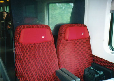 1等車の直ぐ隣には食堂車が連結されています。営業はしていませんが、ちょっと覗いてみましょう。日本の新幹線からは姿を消しましたが、昔懐かしいテーブル席が並んでいます。こんな席で車窓を眺めながらのお食事とワインもいいなあ。。。と、夢は膨らみます。食堂車の先には小さなバーがあって、軽食とか飲み物を売っています。フランスのTGVでは、バーで売られていたワインを全種類制覇しましたが、さすがに今日は何も買う気がしません。おとなしく席に戻ります。