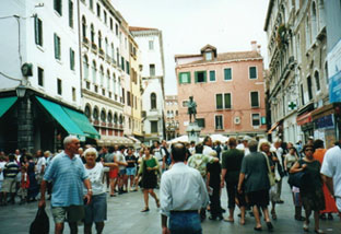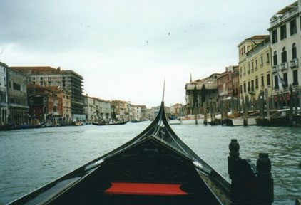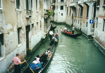 聞くとはなしに聞いていたのですが、どうやらお客さんはアメリカ人の旅行客らしく、コモへの直通列車のチケットを頼んでいるようです。私もコモへは2日後に行く予定にしていたのですが、ガイド本ではミラノのノルド駅から私鉄に乗るという風に書いてありました。あれっ、国鉄でヴェネチアからコモまで行けるんですね。してみると、コモに行くときは国鉄のミラノ中央駅から地下鉄かタクシーを使ってノルド駅まで移動しなくてもいい訳です。これはいいことを聞きました。長いこと並んで待っていたのも無駄ではなかったということです。さて、ようやっと私の順番になりました。折角ですから、ヴェネチアからボローニャまでの短い区間ではありますが、イタリアの誇る最新鋭超特急ユーロスターに乗ることにします。片言の英語で列車のチケットを購入するのはなかなか大変です。特に、混雑した駅の窓口で要領よくポイントを伝えるのは難しいことです。そういう時に力強い味方になってくれるのが前にもご紹介した『イタリア国鉄時刻表』に付属している予約フォームです。これを使って、最小限のやりとりで首尾よく夕方4時過ぎのユーロスターのチケットを購入できました。1等車ですが、お値段は日本に比べたらうんと安かったですね。さあ、これで安心してヴェネチア見物ができます。旅行代理店を出てぶらぶらと歩きますと、街中を張りめぐらす(というか、本当は海が先にあったのでしょうけど)運河に出合います。幅の広いところであればゆったりした橋が架けられるのでしょうけど、狭い街中の橋ではそうもいきません。そこをヴェニス(ヴェネチアより響きがいいですね)名物のゴンドラが観光客を乗せて漕ぎ回っているのです。風情を感じるにはちょと込み合い過ぎていますが、ついカメラを向けてしまいます。