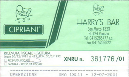 サン・マルコ広場からハリーズ・バーまでは僅か100メートル位の近さですが、どういう訳か1ケ月以上もかかってしまいました。急に決まった引越し、会社の中での異動、それにニューヨークでのテロ(単に、テレビに釘付けになったためなのですが。。。)といろんなことがあって、なかなかハリーズ・バーに辿り着けなかったのですぅ。