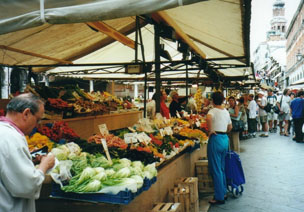 通りの突き当たり(つまり、運河に面したところ)に魚市場があります。古びた倉庫のような建物の中に、築地の場外売り場のような感じでお魚屋さんのお店が並んでいます。台の上には、馴染みのあるお魚(鮪、鯖、鰯、海老など)もそうでない珍しいお魚も沢山並んでいます。どういう訳か、お魚が体を”く”の字に曲げています。あれではお魚をさばきにくいだろうに。。。と思っていましたら、どうやらイタリアではこちらの方が新鮮に見えるらしく、わざと魚屋さんがそうするのだそうです。してみると、曲った胡瓜も高く売れるのかしら。。。