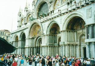結局、マルコ・ポーロとゲーテとカサノヴァにちなんだ建物を見ただけで、ゴンドラはあっけなくサン・マルコ広場の裏手の船着場に着きました。超高額の料金を払ってゴンドラを降りますと、船頭さんが満面こぼれんばかりの笑顔で見送ってくれます。そりゃあそうでしょう。ま、これもいっかぁ。。。と思い直してサン・マルコ広場に出ます。夏の観光シーズンだけあって、広場は世界中からやって来た観光客で溢れています。その観光客以上に多いのがハトの群れです。ヴェネチアの人たちがハトに寛容なのか、あるいは観光客が手なずけしたのか定かではありませんが、ここのハトは人間に対して全く物怖じしません。そのうちにここはハトシック・パークになるのでは。。。と心配になってきます。