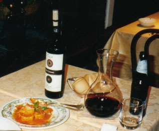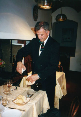 イタリアワインの王様といえばバローロ、女王様といえばバルバレスコですね。どちらもイタリア北部のピエモンテ州産なのですが、同じバローロといってもピンからキリまであります。さすがにこのレストランは地元のグルメ通にも一目置かれているだけあって、バローロのお値段も14万リラ(9千円位)となっています。ひよーーーっ!そ、そんなに贅沢は出来ませーーーん。。。でもそんな気持ちとは裏腹に、ウエイトレスさんには『コレ下さい!』と指差していました。安いワインでしたらウエイトレスさんが栓を抜いたかもしれませんが、馴染みでもない日本人がいきなり高級ワインを頼んだものでお店の方でもビックリしたのでしょう、きちんとネクタイを締めたソムリエのおじさんがうやうやしくバローロを持ってテーブルにやって来ました。さすがに年季の入ったソムリエのおじさんだけあって、栓を抜くのも鮮やかな手さばきです。思わず見とれてしまいます。