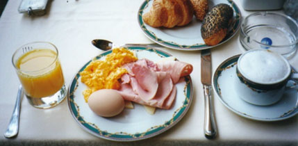 席に着きますと、ボーイさんがやって来てコーヒーのオーダーをとります。イタリアの朝食では、普通のコーヒーとカプチーノの2種類のコーヒーが用意されますが、折角ですのでカプチーノを注文します。カプチーノは、カップの上半分位がクリームの泡で占められていますのでそれほど量が多いという訳ではありません。たっぷり飲みたい方は、普通のコーヒーを注文したら良いでしょう。運が良ければポットに入ったコーヒーが出てきて、タップリ2杯は頂けます。それはそれとして、食の都ボローニャだけのことはあって、朝食とはいってもバイキングスタイルのテーブルには豪華なお料理が沢山並んでいます。いつものように、ハム・チーズ・卵・ソーセージなどなど、恥ずかしげもなくお皿に溢れんばかりのてんこ盛りにします。さすがにお料理の素材はいいですね。とりわけ卵はとても色が濃く、新鮮そのものの感じがします。食べてみますと、その味の濃さにまたまた驚かされます。滋養に富んだ美味しさとはこのことを言うのでしょう。爽やかな朝の庭園を眺めながらの朝食はまた格別です。