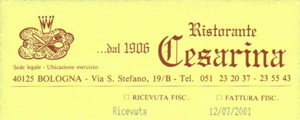 で、今夜のお食事なのですが、ボローニャの数あるレストランの中で、地元のグルメにも一目おかれているお店に行こうと思います。フロントで訊いてみますと、ホテルから歩いて20分位のところにあるとか。夕方の暑い時間帯ではあるのですが、場所を書き込んで頂いた観光地図を握り締めて街中に出かけます。日本の感覚からしますと、ボローニャの町は人口10万人位の感覚にしか思えませんが、ユーロッパ最古の大学とか宮殿とかがあって、町中が中世の趣をなしています。石造りの建物が多いためか、城壁の中を歩いているような気にさえなります。商店街を抜けてレストランの方角に歩いて行きますと、交差点の角に2本の細長い塔が立っています。これがボローニャのシャトー。。。じゃなくって、斜塔のようです。高所恐怖症ではあるのですが、高い塔が目の前にありますとつい登りたくなってしまいます。どれどれ。。。と入り口を探しましたら、夕方のためか既に扉は閉められていました。ホッ。。。陽が落ちてちょっと薄暗くなってきました。細い裏通りを歩いて行きますと、通りの至る所にいろんな国の人たちが座り込んでいます。ボローニャ大学への留学生なのでしょうか、世界中の国からやってきたかのようです。今夜のディナーを頂く『CESARINA』は、そんな裏通りにある小さなレストランです。未だディナー・タイムが始まったばかりのようで、ドアを大きく開け放たれたお店には1−2組のお客さんしかいません。日本人は珍しいようで、ちょっとドキマギします。奥のテーブルに案内されました。やれやれ、やっとまともなお食事にありつけます。